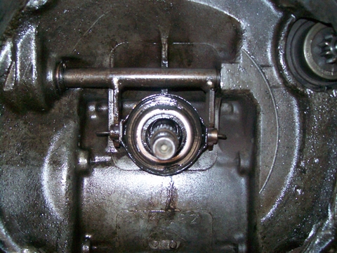 En esta caja de Split o sea de Tipo1 se puede ver como la cañonera entra a la caja de cambios por medio de una Bocha que en la tapa lateral ajusta con una media esfera, esta tapa lateral de chapa que es mas pequeña que la de aluminio, es la que sostiene la Bocha de la cañonera, la otra tapa mas grande de aluminio es la que permite sacar el diferencial, además de invertirlo ya que si se usaba esta caja para los Escarabajos sin Reductoras se podía invertir la corona del diferencial y así usar la misma caja de velocidades, esto se debe a que si tiene reductoras en la desmultiplicación de engranajes de los ejes de las ruedas se invierte el giro, por eso es imprescindible que el diferencial gire para el otro lado.