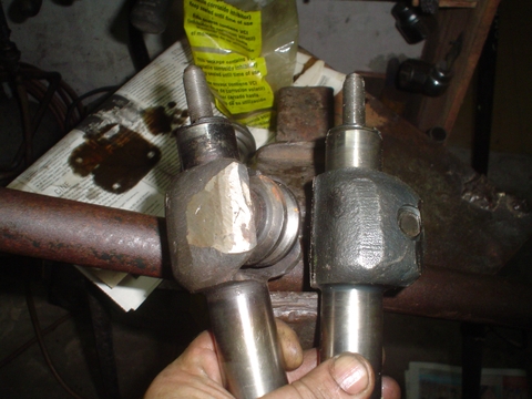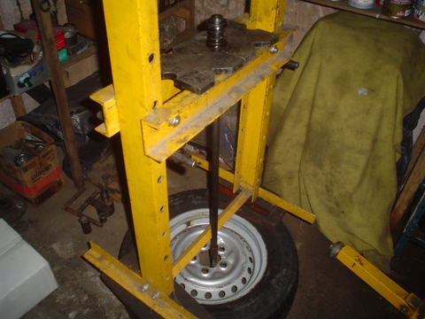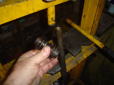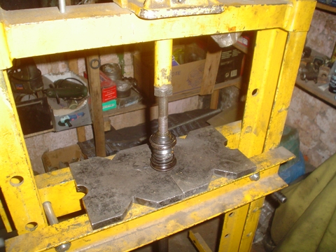 Ponemos la prensa hidráulica en altura para poder colocar el barral, o si tienen una prensa alta mejor JEJE!! colocamos el barral con el sin fin para arriba trabándolo bien, antes lógicamente sacamos el rulemán que estaba en la parte superior desenhebrándolo del mismo barral hacia la rosca del volante.