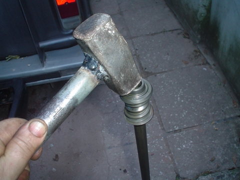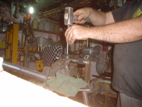 Golpeamos con masa mediana sin piedad!!!, angulamos la masa para que quede golpeando en el Borde Biselado del Sin Fin pero igual no se preocupen, el Sin Fin es mas duro que la Masa de Hierro común, así que no lo afecta y entra clavado de forma perfecta, la madera de abajo protege la rosca de la tuerca del volante, usen madera dura cedro o algo así.