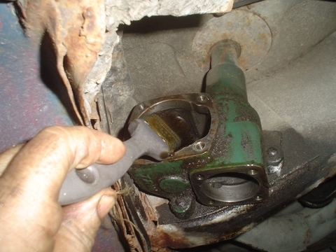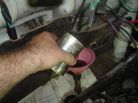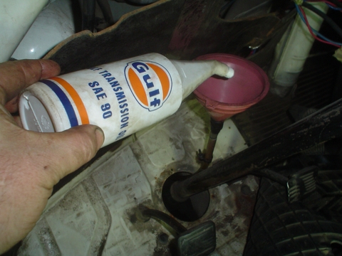 Dese arriba y con un embudo preparado con manguera en la punta, embocamos dicha manguera en el orificio que nos deja el tapón al sacarlo y agregamos 300cm3 aprox. de Grasa para transmisión SAE90.