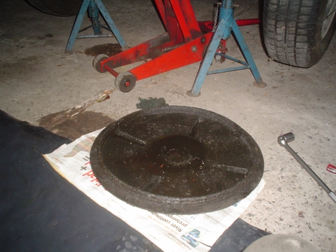 Ponemos debajo de la kombi un recipiente grande atajador de aceite para el desborde, en mi caso uso un vieja tapa de tanque de agua de plástico.