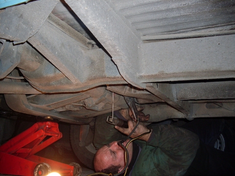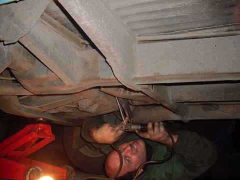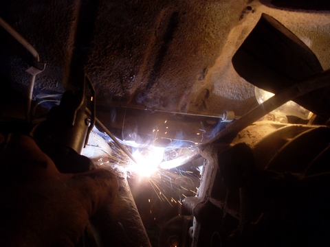 En esta imagen me pueden ver mientras sueldo esta pequeña pieza de chapa No es fácil porque esta en un lugar difícil, si no esta el motor colocado es mucho mas fácil porque se puede soldar por el lateral de la caja de cambios, pero a veces tengo que soldar con toda la kombi armada.