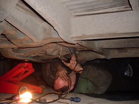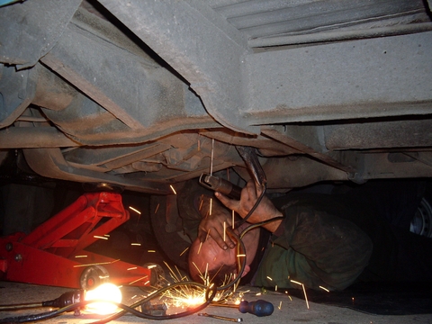 La soldadura en este caso es mas fácil y se puede trabajar con la mascara y con todo los recaudos necesarios, yo personalmente dejo un pomo con agua al lado mío ya que en esa zona hay mucha grasa o pintura y se enciende al soldar, no mucho pero prefiero tener un pomo para rociar con agua en el caso que el fuego no apague soplando, también uso el compresor de aire porque a veces soplando me mareo, jeje!!!