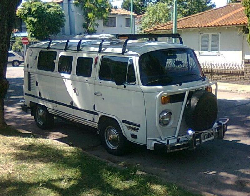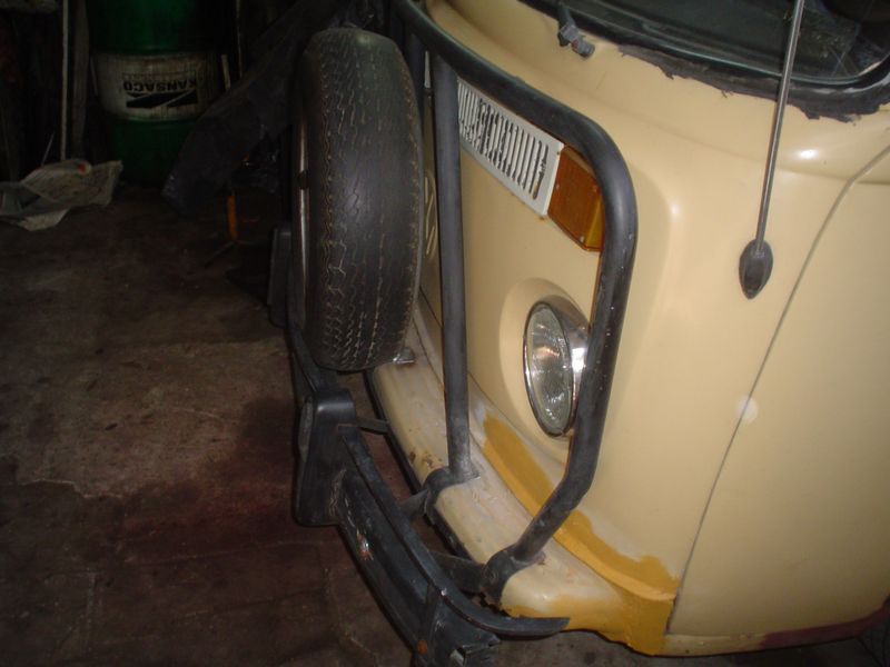 Como se puede ver en esta hermosa Kombi su defensa fue colocada y modificada para que su paragolpes quede por delante, estirando el vehículo unos centímetros más y permitiendo colocar la rueda de auxilio en la trompa, de esta manera si esta autorizado por la ley a circular. Como podemos ver esa rueda de auxilio a pesar de que queda como un grano en la nariz será nuestro salvavidas por si algún conductor inescrupuloso se le ocurre ir marcha atrás y tocarnos nuestro vehículo.