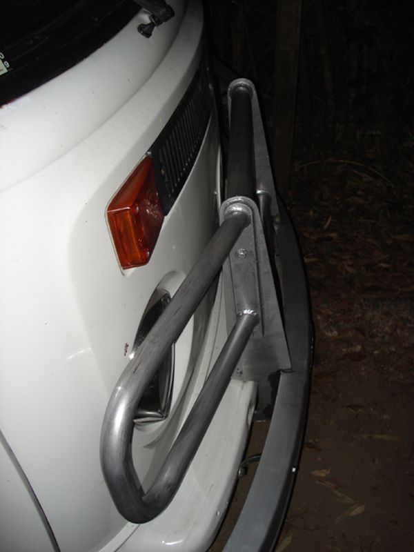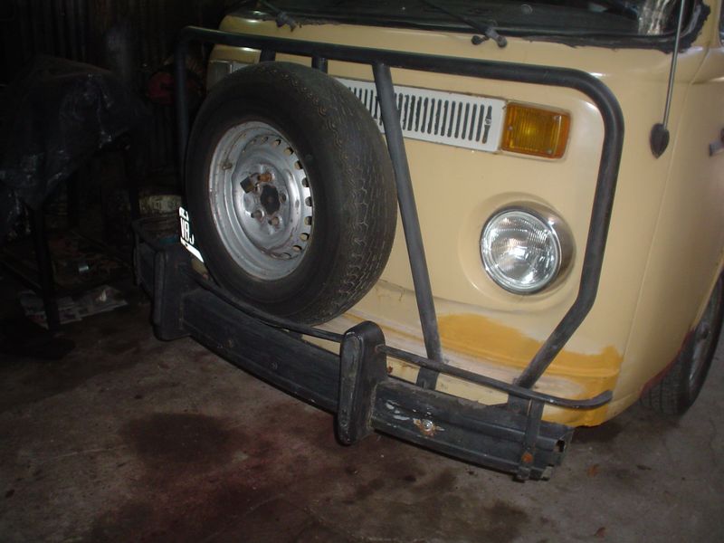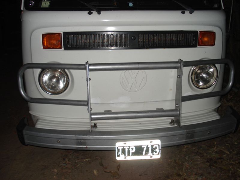 Esta defensa a es la denominada del tipo "Anteojos", en este caso también venía una similar trasera, como se puede observar el paragolpes esta por delante de la defensa cumpliendo las normas de tránsito, esto es una modificación realizada en SoloKombis debido a que no pasaban la verificación técnica, a partir de esta modificación no tuvimos más inconveniente usando defensas del tipo "Anteojos" en nuestros vehículos.
