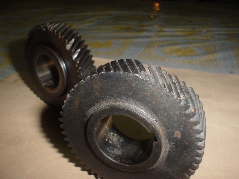 En esta imagen se puede ver el engranaje con sus dientes oblicuos quebrados de forma recta. Es muy extraño pero la respuesta a esta característica esta dada porque los engranajes giran de forma recta y eso hace que el quiebre se produzca de esta manera. los Dientes Oblicuos o Helicoidales lo son propicios para que sean silenciosos y al ser este engranaje de dientes finos son mas "Silenciosos" aun a altas velocidades.
