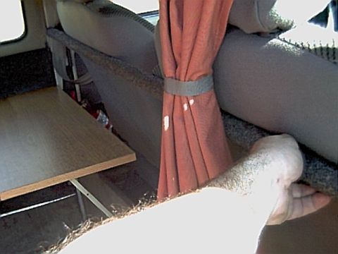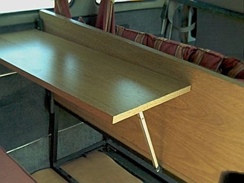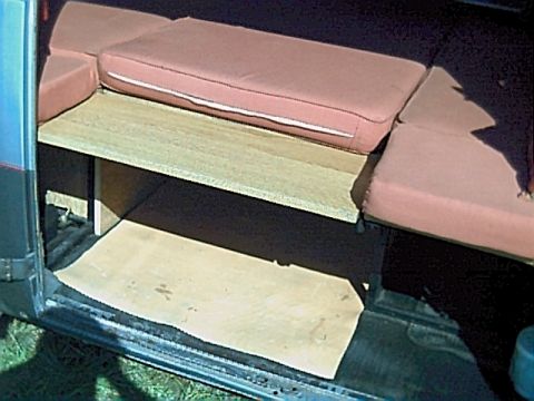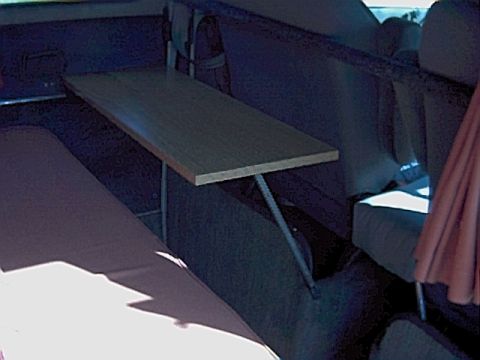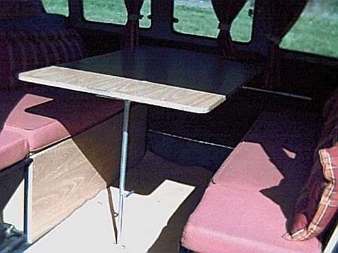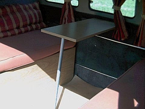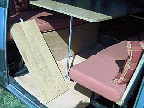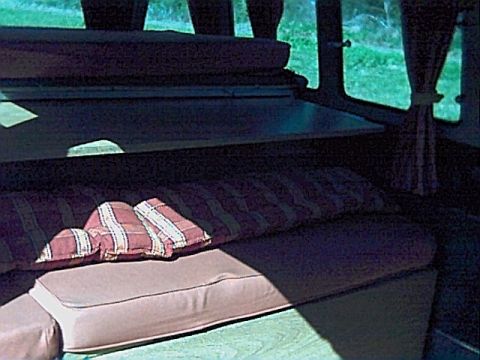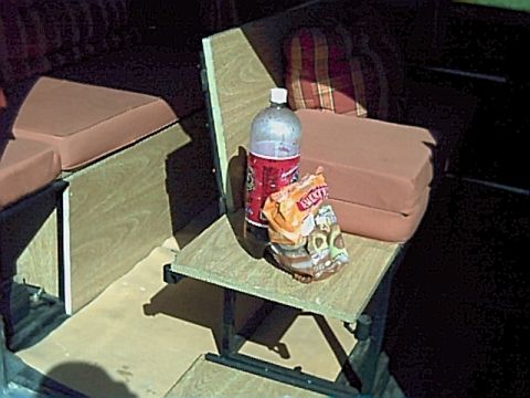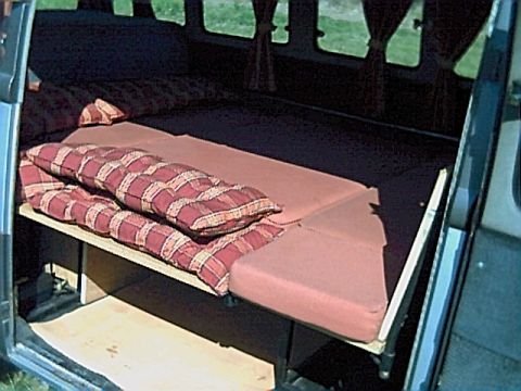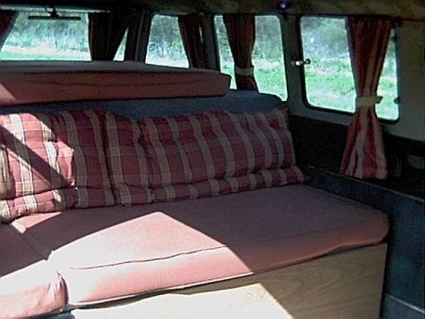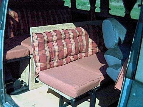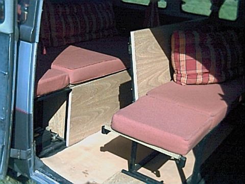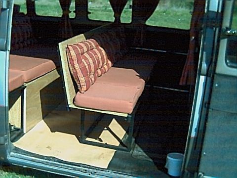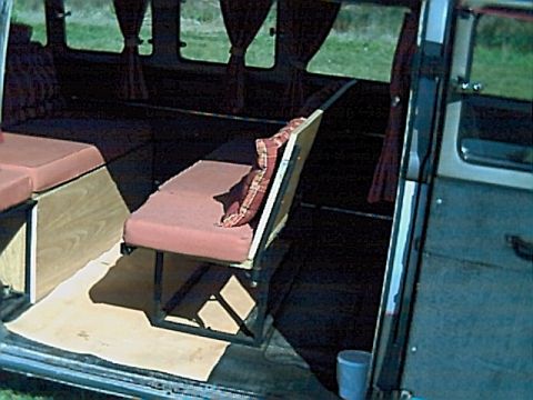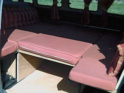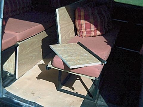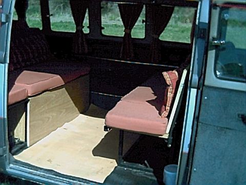Este es un modelo de Camper discreto, en mi KOMBI los Muebles no tienen espacio ya que somos muchos Tripulantes por eso Fabrique estos sofá camas y mesas rebatibles, que a la hora de funcionar lo hacen muy bien, son muy útiles y todo se desmonta quedando la totalidad de la capacidad de carga para usarla como uno quiera, aunque con los sillones también es muy espaciosa, llegamos a viajar cómodos 12 personas en total, más 2 bebes durmiendo en la parte de atrás o sea 14 mas bolsos de mano, la Kombi respondió bien y nos llevo a 100 kmh cargada, pero la dirección estaba un poco pesada para mi gusto.