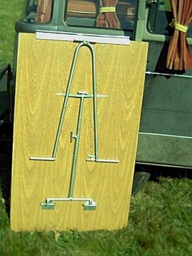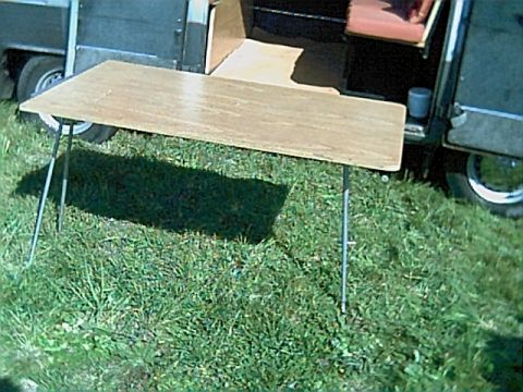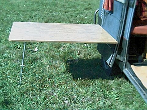 La mesa Grande se saca afuera y se engancha con unos acoples al portón lateral abierto, la pata es telescópica y se regula según la altura del terreno, incluso esta calculada para el cordón de la vereda..