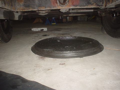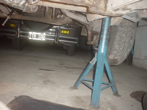 Lo primero es levantar la Kombi desde atrás Bien alta!!! fíjense donde quedaron las ruedas, la idea es ponerla de forma inclinada para adelante, también podría hacerse para atrás pero generalmente lo peor se encuentra en la parte cercana a la caja de cambios.