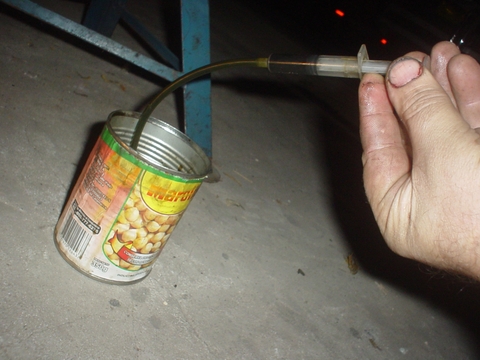 Con una Jeringa y una manguerita insertada en la punta pequeña, cargamos de aceite la jeringa por succión, la llenamos por completo.