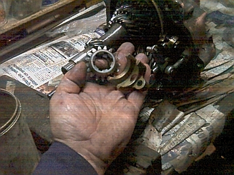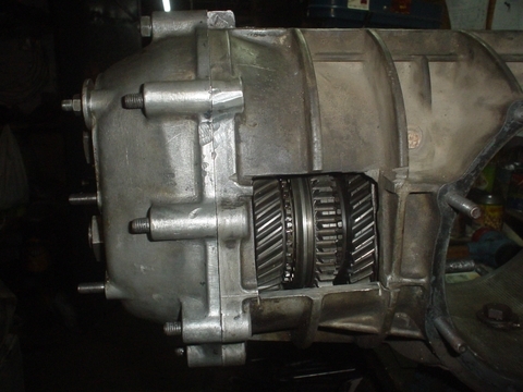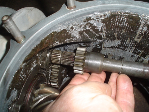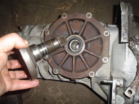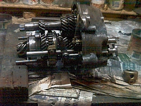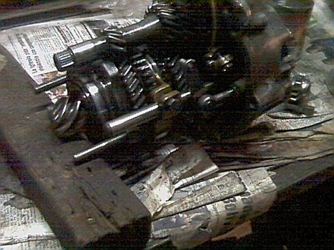 La cola de la caja de cambios sale con todos los engranajes completos, nada quedara en la carcaza, incluso se desprenderá el engranaje de marcha atrás (se ve a la derecha de la imagen), no tenemos que asustarnos nada de lo que se desarme es algo que no se puede volver a armar.