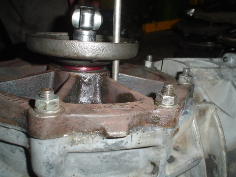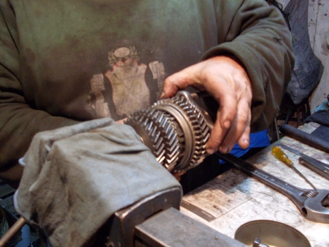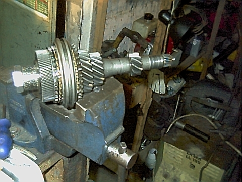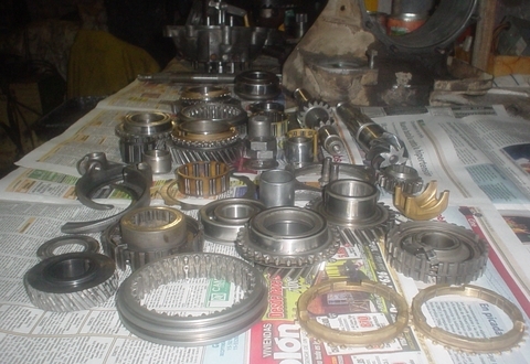Una vez que tenemos todos los ejes libres siguiendo los pasos que nos indica el manual que les sugiero bajar de esta web, podemos por medio de prensa hidráulica desclavar todo y lavarlo, no utilice golpes de martillo porque se dañan los dientes de los engranajes, sobre todo el de paso fino de 4ª, es importante disponer de extractores, prensas y todo las herramientas indicadas para el desarme y el posterior armado, si no será muy improvisada la reparación y posiblemente no quede bien.
