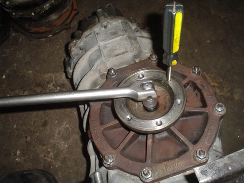 Ahora solo queda apretar la cola de forma que nos permita accionar todos los mecanismos como si estuviera colocada en el vehiculo, además ponemos los 2 tornillo 15 mm del cuadrante del eje piñón para asegurarnos que dicho eje queda debidamente alineado ya que en los otros 2 orificios tenemos los espárragos guías, luego ponemos 3ª y Marcha atrás al mismo tiempo, le colocamos el acople de la directa que une los ejes, y de esa forma nuestros engranajes quedaran bloqueados sin movimiento, así podremos aflojar los tuercones de 32 mm que tenemos en la cola, previamente sacando los seguros de chapa que están doblados.