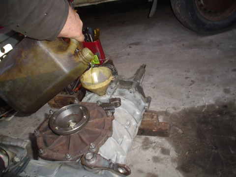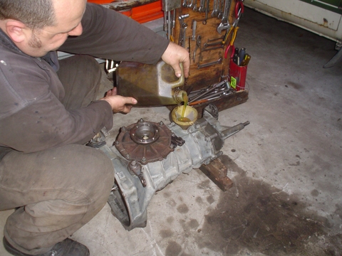 Antes de colocar la caja de cambios en el vehiculo, debemos llenar con Grasa SAE90 tenemos que colocarle 3 litros ya que luego al hacer el recambio solo saldrán 2.5 litros dejando para seguridad 1/2 litro que nunca se pierde pero que se pondrá duro si seguimos andando sin revisar el nivel cada 5000km aprox., no debemos dejar de camiar todos los retenes que son 3 - 1 de eje de directa y 2 de tapas de diferencial, una vez que cargamos el lubricante apretamos bien el tapón lateral, no usen aceites o grasas multigrados ni aditivos, necesitamos GRASA pesada para diferencial, hoy en día los autos modernos usan aceites o grasas mas livianas por tener diferenciales pequeños pero el servicio que nos brinda una kombi es pesado como un camión, por lo tanto no debemos dejar al diferencial con un lubricante incorrecto, al tener todo junto en una misma carcaza la caja de cambios recibe el mismo lubricante.
