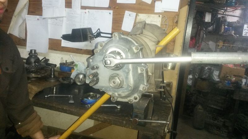 Es momento de ajustar definitivamente nuestros Tuercones traseros de cola, como podemos ver en la imagen con un caño trabamos la Carcaza y con una palanca de tubo 32 y un caño le damos el Toque necesario!! lleva mucho Torque y no se afloja como dice en algún manual 1/8 eso es para las cajas de cambios antiguas. Estos rulemanes son doble conos y tiene una tuerca preliminar en el eje del piñon para darle un ajuste individual.