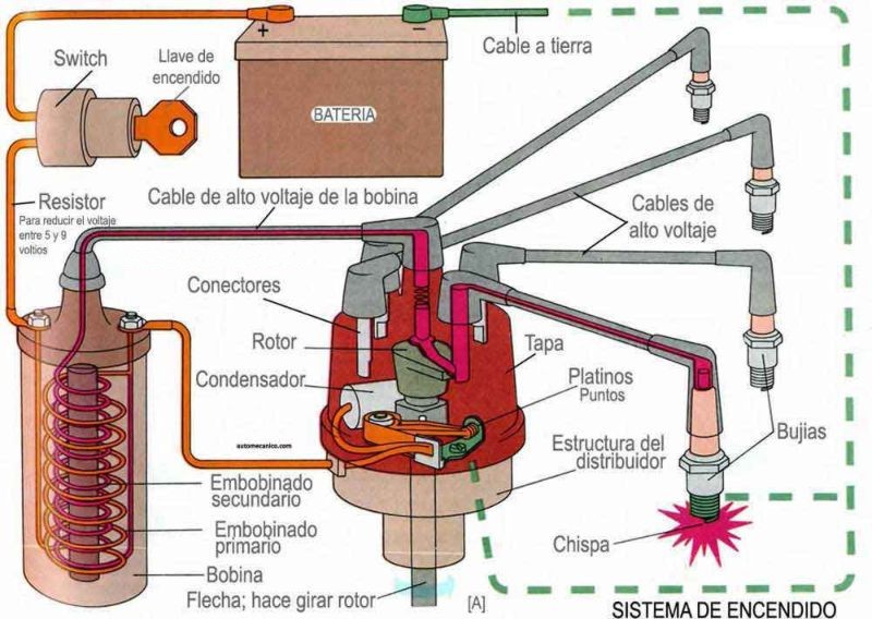 La energía positiva entra nuestra bobina de encendido a través del terminal positivo luego de dar ignición a la llave de contacto, el bobinado interno tomará negativo de nuestro contacto a masa por medio del platino, al girar el distribuidor dicho platino interrumpirá el contacto a masa, de esta forma la bobina que estaba excitada con energía se descargará a través del otro bobinado de alta tensión. Este bobinado tiene un cable maestro que va al centro del distribuidor, dicho cable se conecta a través de un carbón de raspado con el rotor que está en el eje, este eje es comandado por un sistema de engranajes en el interior del motor, el rotor no tocará la punta de los contactos sino que permitirá un pequeño salto de chispa en el aire, esta chispa viajará por el cable que va hacia la bujía y volverá a saltar otra chispa en el electrodo de la bujía, por lo tanto la chispa saltara dos veces en todo el sistema por cada cable y por cada bujía. Esto presenta en muchas ocasiones una falla debido a que la chispa no tiene la fuerza suficiente para saltar dos veces y se apaga. En el distribuidor junto al platino tenemos un condensador este elemento es el encargado de absorber la energía que salta entre los contactos del platino para evitar una tercera chispa que consumiría mucha energía y no permitiría que salte en la bujía como lo necesita. Esta corriente parasitaria que hay entre los contactos del platino es normal debido a que en la separación repentina se produce una necesidad de seguir obteniendo masa del sistema, la bobina de encendido al ser de alta tensión genera un retroceso y una petición de negativo que la quiere solucionar con un poco de energía como si estiramos nuestro brazo para sostenernos al caer. Esta energía parasitaria quiere generar un puente y el condensador será quien lo evite absorbiendo la pequeña carga que se dispara entre los contactos y enviandola a través de una cera y láminas de aluminio en su interior a masa sin perjudicar el funcionamiento de ningún tipo de sistema eléctrico, o sea la descarta.