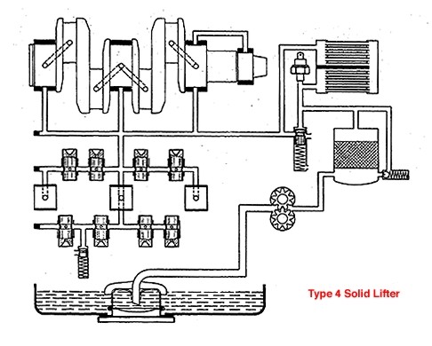Este es un circuito de motores boxer mas modernos con cartuchos de filtro de aceite, la válvula adicional en el cartucho controla la posible falla de que estuviera el mismo tapado y el paso del caudal controlado también por el limite que el mismo filtro pone en su funcionamiento.