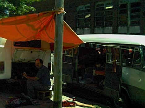 Improvisamos un toldo para no cocinarnos por ahora este será nuestro taller Kombinauta....