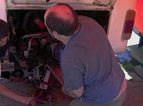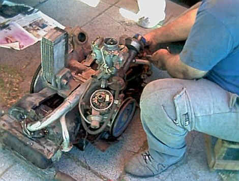 En mi segunda Visita a Alejandro Acosta en Hurlingham, fui con la premisa de sacar el motor para cambiar un Perno y Buje del cilindro 2 que supuestamente golpeaba, como recalentó el motor por cortar la correa y no darse cuenta a tiempo, Alejandro empezó a escuchar ruidos de martillazos al andar, sin embargo no había falla o Fumada la Kombi parecía reaccionar bien, pero era imposible hablar estando al lado del motor en Marcha, así que decididos a desarmar y a bajo costo (precio) para que Alejandro lo pueda hacer, despiezamos el motor en la Vereda.