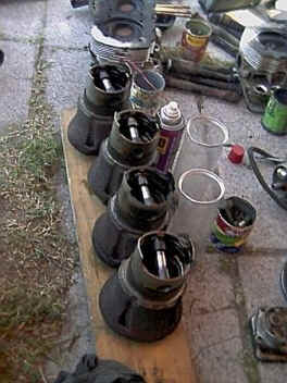 Los pistones no los sacamos del todo y no los giramos marcamos cada cilindro con su numeración, los aros son nuevos y el motor no fumaba nada y tenia potencia, así que ahorramos repuestos y trabajo dejando los mismos, se probo el juego del pistón y no registra nada de movimiento la verdad es que están mejor que los míos y mi Kombi da 110 Kmh, así que la de Alejandro me tiene que dejar parado JEJE!!!, aunque tiene ruedas 65 y son muy chiquitas de abajo me gana pero arriba no se....