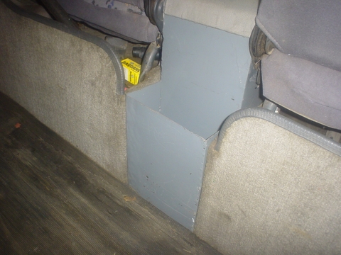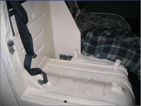 En esta imagen se puede ver el chapon cortado pero se conservo todo los refuerzos originales y se dejo una pequeña escuadra en la parte baja, esto se hizo no solo para poder pasar para atrás si no para reclinar las butacas, como en mi kombi, solo que se usaron Butacas mas angostas sin apoyabrazos y se consiguió un pasadizo bastante amplio.