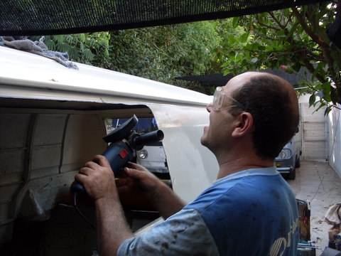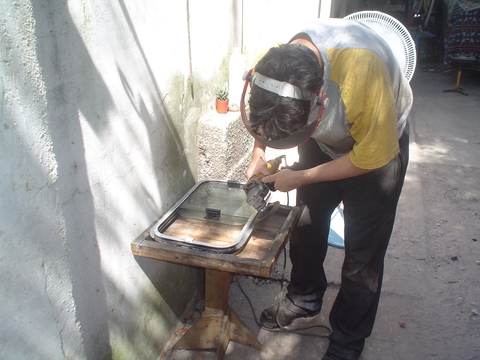 El corte con amoladora es el mismoo que en el articulo anterior, teniendo en cuenta las curvas y cuidando de que la pintura no se queme o se aglobe, el disco que uso es de 1.6 mm pero podría usarse disco de 1mm aunque es muy peligroso porque puede partirse, como se ve estoy protegido con mangas de cuero y mascara completa, ya estoy un poco mas conciente de que debo cuidarme y cada vez que uso la amoladora cuido mi integridad absoluta después de algunos accidentes en los brazos, la mascara completa me ayuda a poder usar mis antejos de leer que a mis 46 ya son parte de mi cuerpo jeje!!