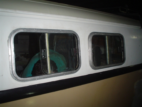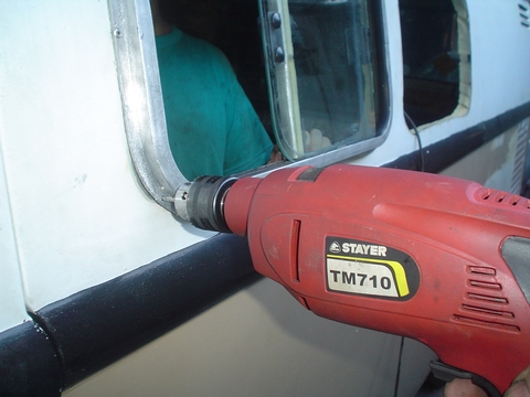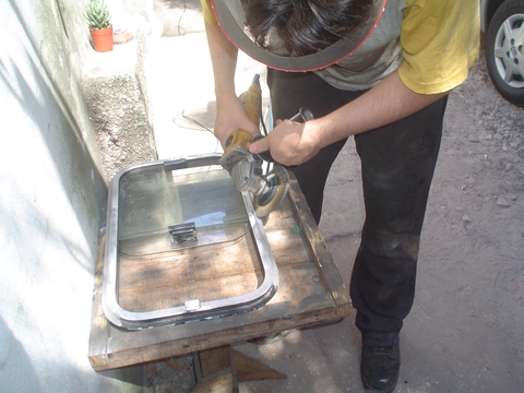 Ya estamos listos!! mientras Matías le pone a cada ventana un contorno de silicona transparente yo preparo la agujereadora y los remaches de 4 mm para amurar las ventanas a la chapa.