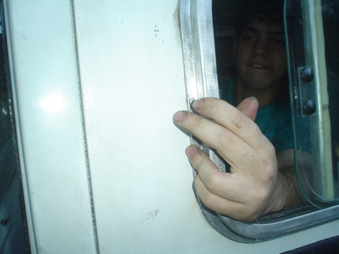 Matías del lado de adentro trabaja junto a mi para embocar los remaches y no suelta la ventana para nada.