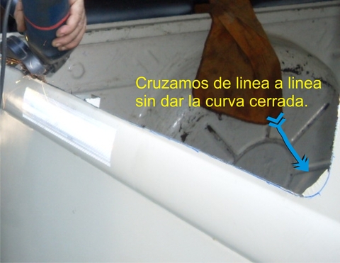 Como se ve en esta imagen abajo a la derecha, en los ángulos cruzamos el corte de forma que nos permita angular la amoladora, como no es un corte muy preciso vamos dejando el sobrante para adentro de la marca y así después molarlo con el disco de canto.