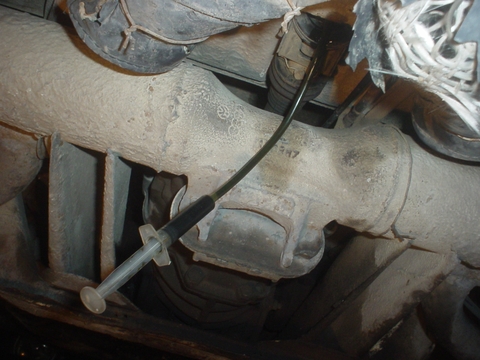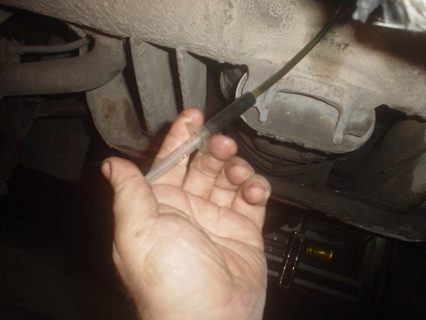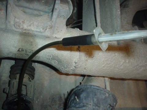 En la parte delantera ponemos un recipiente justo donde termina la vaina del chasis en la otra punta, esto es para atajar el lubricante que va a caer en el llenado del tubo.
