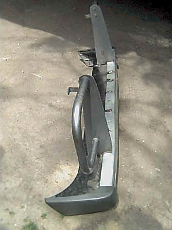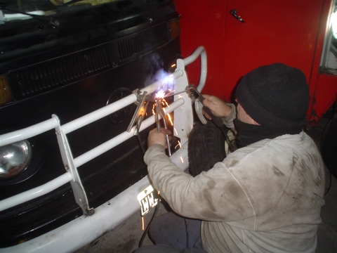Como se puede ver en esta imagen, el Paragolpes original fue removido se coloco primero la defensa abulonada en los soportes originales y luego se le fabricaron tensores, también se le soldó el Paragolpes en la defensa y soportes de apoyo en las puntas para que cuando el paragolpes sea tocado por algún vehiculo no se deforme la punta del mismo, en las siguientes imágenes veremos mas detalles.