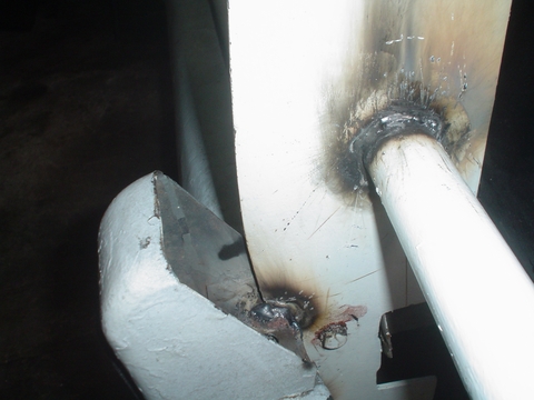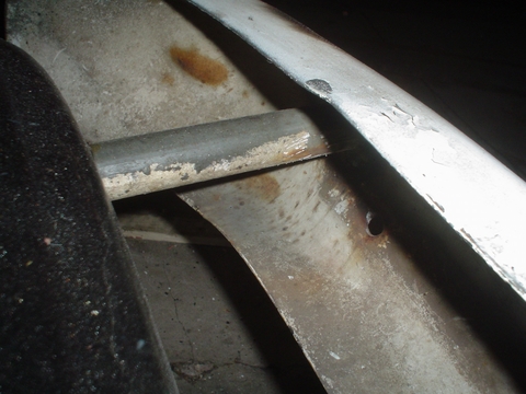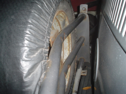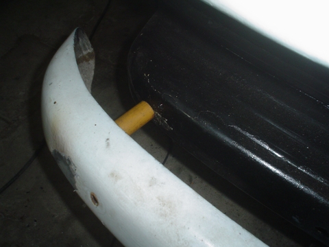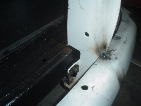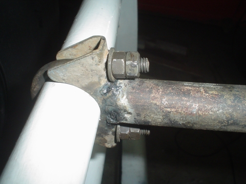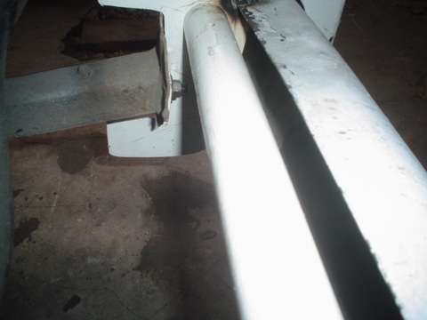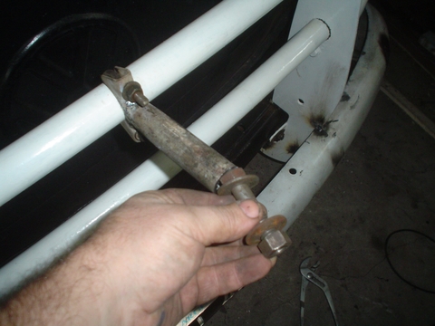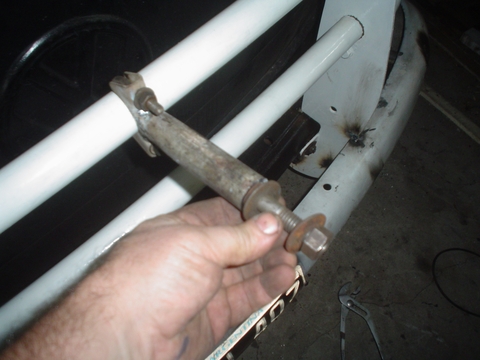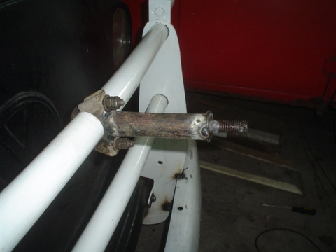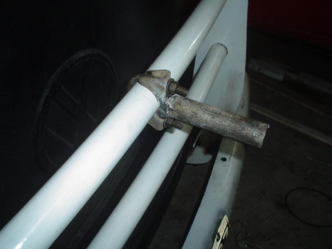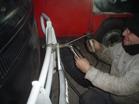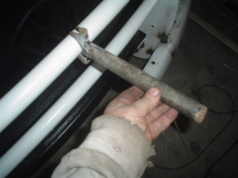En esta imagen se ve el caño amarillo que es el del otro lado y esta soldado en el paragolpes para apoyar la puntera sobre la carrocería de la Kombi, en el extremo que apoya la Kombi no lo soldamos.