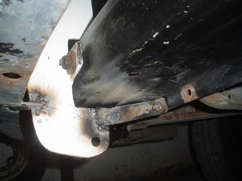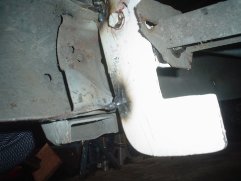 Por la parte baja se ven las Planchelas de apoyo y los tensores, en la Izquierda de la imagen colocamos una Planchuela para apoyar el paragolpes que quedaba separado por su postura al soldarlo en la defensa, a la Derecha de la imagen se ve el tensor de Planchuela que esta soldado en la defensa y abulonado en el labio de la parte baja del Pulmón de Choque o también llamado Canoa.
