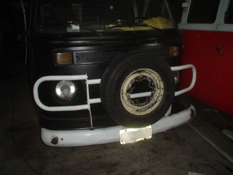 Como se puede ver aunque esta un poco oscura la foto, le hice un Babero de Chapa del 18, (mi fiel amiga), y la soldé por debajo del ParaGolpes, para este caso también hice una Plantilla de Cartón, con el ParaGolpes colocado, después hice los cortes para unas luces de Marcha Atrás Alógenas, estas luces con un Relay prenden con las luces originales de la Kombi o las prendo con una Perilla de adentro de la cabina, para conductores molestos, realmente para atrás con la luz original de la Kombi no se ve nada, era una necesidad, además de una gran sorpresa para Bocinazos molestos, JEJE!!