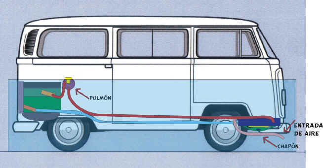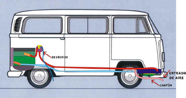 Con una manguera de Desborde, controlamos los excesos de Densidad del agua o liquido refrigerante, enviándolo al Exterior y evitando que cuando la tapa del Pulmón abra se llene todo el habitáculo del motor de liquido caliente.