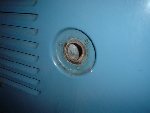 El caño de carga de las Kombis con tanque pequeño estaba detrás de una puerta como dije al principio de este articulo, como se ve se sella con una goma de contorno sobre una bandeja que tiene un drenaje, al costado de la tapa es donde debemos colocar un respiradero si no usamos el del tanque que tiene al lado del marcador de nivel de combustible al reformarlo, cuando hacemos la reforma queda ese pico sin conectar o lo anulamos o lo usamos como venteo, pero no debemos dejarlo sin conectar y abierto lógicamente....Estos tanques pequeños venteaban por su tapa y si tenían derrame la bandeja guiaba la nafta que rebalsaba por un caño hacia el suelo.